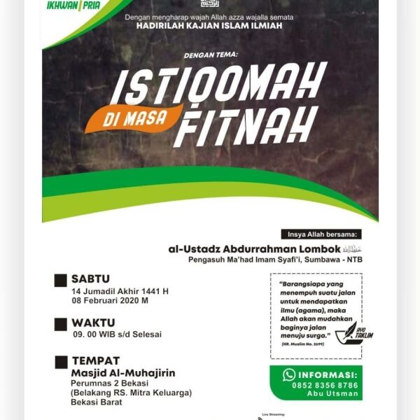 Al Ustadz Abu Usamah Abdurrahman Lombok Istiqomah Dimasa Fitnah 2 Tracks 0 Suka Laporkan A Al Ustadz Abu Usamah Abdurrahman Lombok 2 tracks Istiqomah Dimasa Fitnah - 1 Istiqomah Dimasa Fitnah - 2 Kajian lainnya oleh Al Ustadz Abu Usamah Abdurrahman Lombok Sebab-Sebab Berpaling Dari Al-Haq Indahnya Berbangsa Dan Bernegara Dengan Akhlaq Mulia Istiqamah Di Tengah Gelombang Fitnah Tawakkal Merupakan Tanda Keimanan Seorang Mu’min