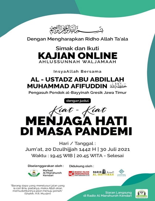 Al Ustadz Muhammad Afifuddin as-Sidawy Kiat-kiat Menjaga Hati di Masa Pandemi 1 Track 0 Suka Laporkan M Al Ustadz Muhammad Afifuddin as-Sidawy 1 track Kiat-kiat Menjaga Hati di Masa Pandemi - 1 Kajian lainnya oleh Al Ustadz Muhammad Afifuddin as-Sidawy Perjuangan Dakwah Rambu-rambu Syariah di Masa Fitnah Pertemuan ke-2 Nasehat adalah Tanda Cinta Taqwa Solusi Jalan Keluar dari Berbagai Fitnah