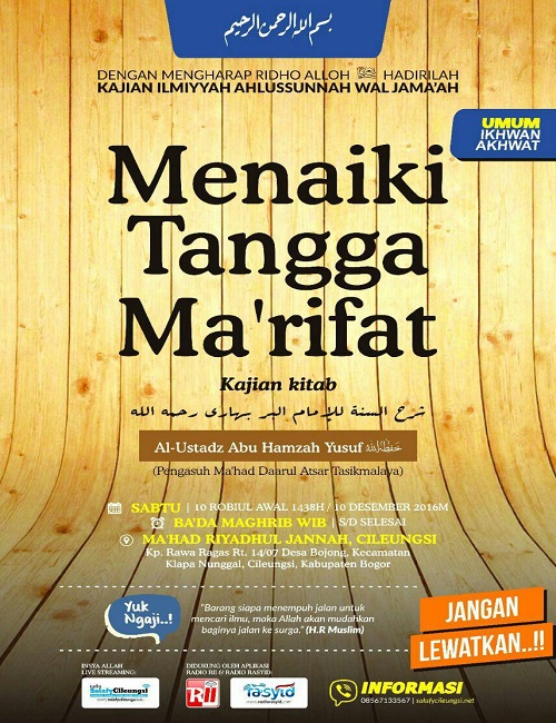 Al Ustadz Abu Hamzah Yusuf Menaiki Tangga Ma’rifat 1 Track 0 Suka Laporkan A Al Ustadz Abu Hamzah Yusuf 1 track Menaiki Tangga Ma’rifat - 1 Kajian lainnya oleh Al Ustadz Abu Hamzah Yusuf Tetaplah Menjadi Yang Terbaik Takdir-Mu Terbaik Bagiku Kenali Hakmu, Tunaikan Kewajibanmu Ketika Nikmat Jadi Musibah