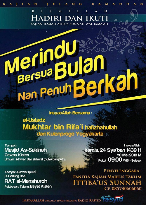 Al Ustadz Abu Nasim Mukhtar bin Rifai Merindu Bersua Bulan Nan Penuh Berkah 2 Tracks 0 Suka Laporkan A Al Ustadz Abu Nasim Mukhtar bin Rifai 2 tracks Merindu Bersua Bulan Nan Penuh Berkah - 1 Merindu Bersua Bulan Nan Penuh Berkah - 2 Kajian lainnya oleh Al Ustadz Abu Nasim Mukhtar bin Rifai Pentingnya Mendidik Anak Wanita Berteman itu, Jangan Begitu Tarbiyatul Aulad Ibarat Telaga Untuk Berlapang Dada