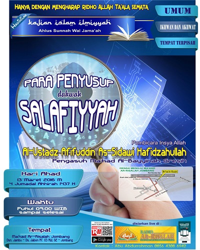 Al Ustadz Muhammad Afifuddin as-Sidawy Para Penyusup Dakwah Salafiyyah 2 Tracks 0 Suka Laporkan M Al Ustadz Muhammad Afifuddin as-Sidawy 2 tracks Para Penyusup Dakwah Salafiyyah - 1 Para Penyusup Dakwah Salafiyyah - 2 Kajian lainnya oleh Al Ustadz Muhammad Afifuddin as-Sidawy Perjuangan Dakwah Rambu-rambu Syariah di Masa Fitnah Pertemuan ke-2 Nasehat adalah Tanda Cinta Taqwa Solusi Jalan Keluar dari Berbagai Fitnah