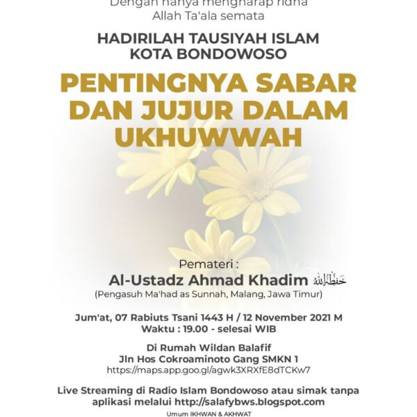 Al Ustadz Ahmad Khadim Pentingnya Sabar dan Jujur dalam Ukhuwah 1 Track 0 Suka Laporkan A Al Ustadz Ahmad Khadim 1 track Pentingnya Sabar dan Jujur dalam Ukhuwah - 1 Kajian lainnya oleh Al Ustadz Ahmad Khadim Kokoh Diatas Sunnah Di Antara Kiat Selamat dari Fitnah (Ujian) Perhatikanlah Amalanmu Keutamaan Sabar Dalam Menghadapi Ujian