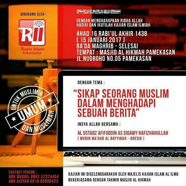 Al Ustadz Muhammad Afifuddin as-Sidawy Sikap Seorang Muslim dalam Menghadapi Sebuah Berita 2 Tracks 0 Suka Laporkan M Al Ustadz Muhammad Afifuddin as-Sidawy 2 tracks Sikap Seorang Muslim dalam Menghadapi Sebuah Berita - 1 Sikap Seorang Muslim dalam Menghadapi Sebuah Berita - 2 Kajian lainnya oleh Al Ustadz Muhammad Afifuddin as-Sidawy Perjuangan Dakwah Rambu-rambu Syariah di Masa Fitnah Pertemuan ke-2 Nasehat adalah Tanda Cinta Taqwa Solusi Jalan Keluar dari Berbagai Fitnah